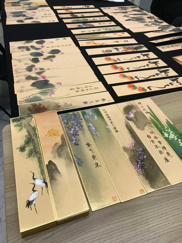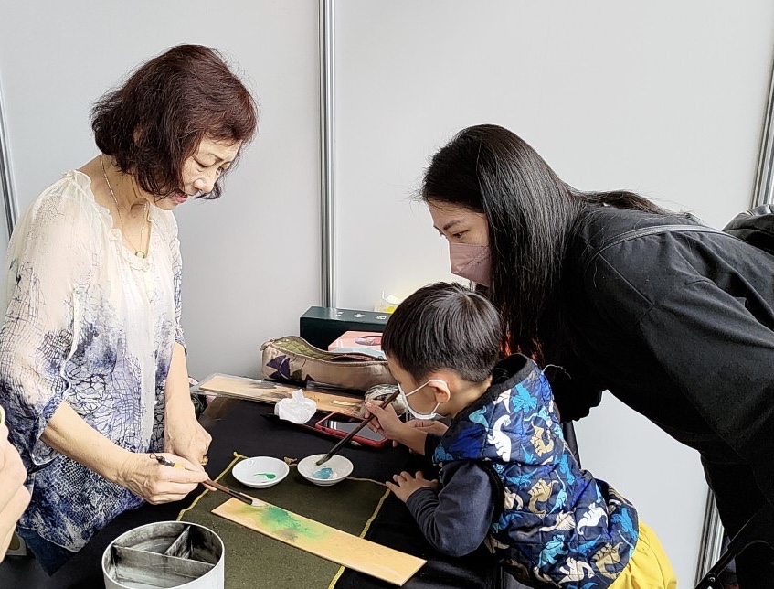 中華書道學會為推廣書藝,免費體驗瓦當拓印、書籤創作書寫,另外,提供金潜板流墨茶掛畫限量收藏,並隨作品附贈快篩劑一份與中華書道學會季刊一本,物超所值。攤位現場金色光芒喜氣加持,創作發想特別帶入五行的觀點,墨色為黑,代表為水,金色潜板,象徵富足,以金生水,有緣收藏風生水起。我們以「惜墨如金」的創作精神,祝福大家「點墨成金」。