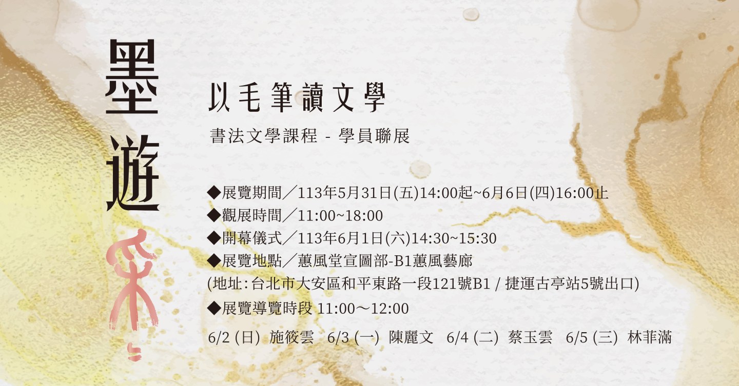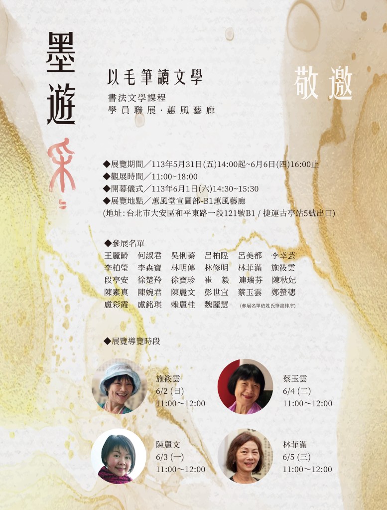 在文學的滋育下,蘊養出不同的墨韻風采,【墨遊采采-以毛筆讀文學學員書法聯展】2024/5/31-6/6 於蕙風藝廊展出,由施筱雲老師教授分享之課程,帶領學員悠遊賞析歷代名家書作,細細解說朝代歷史、作者生平和文化內蘊,從2020年起至今已累積了22個主題,145堂課人文的宏觀薰陶與模仿習寫,歷屆學員們共同在課程的薰陶下精進書法,成就了這場積累無數時光的聯合展覽!
