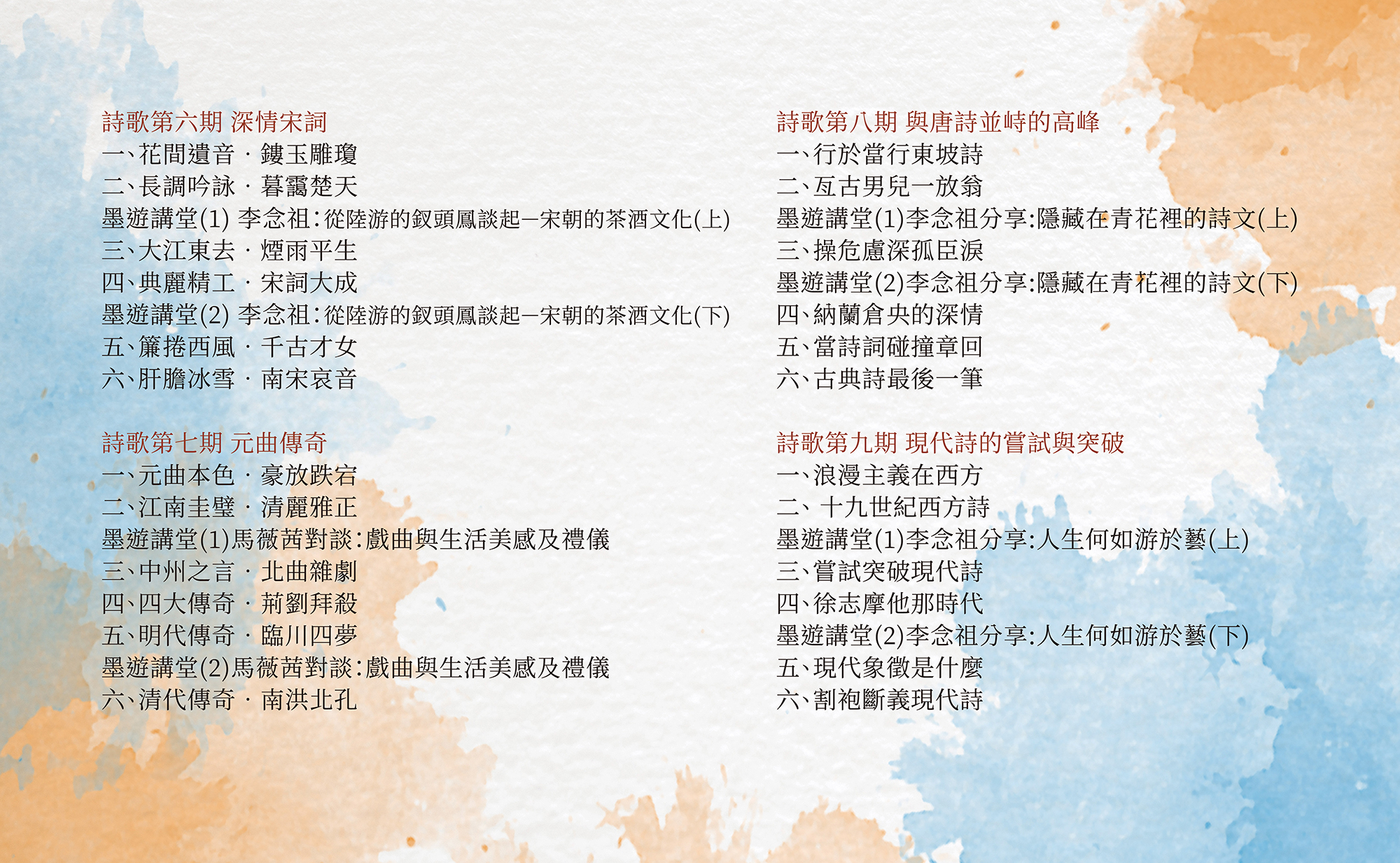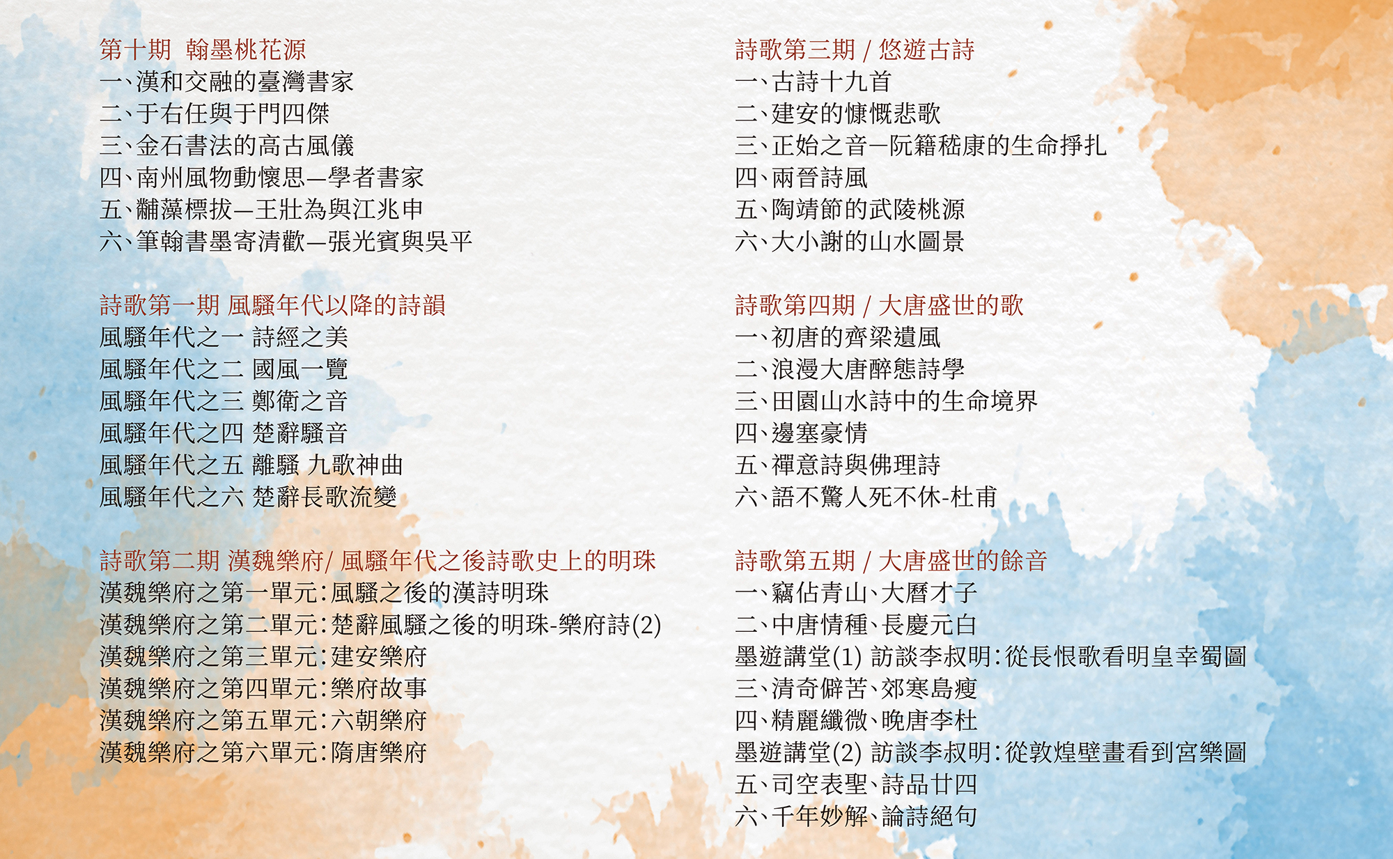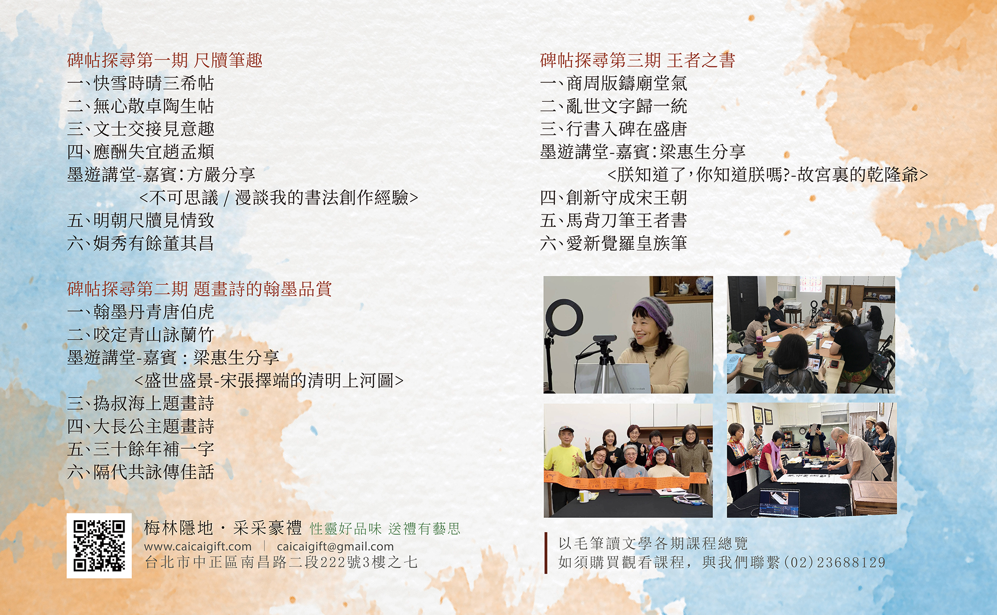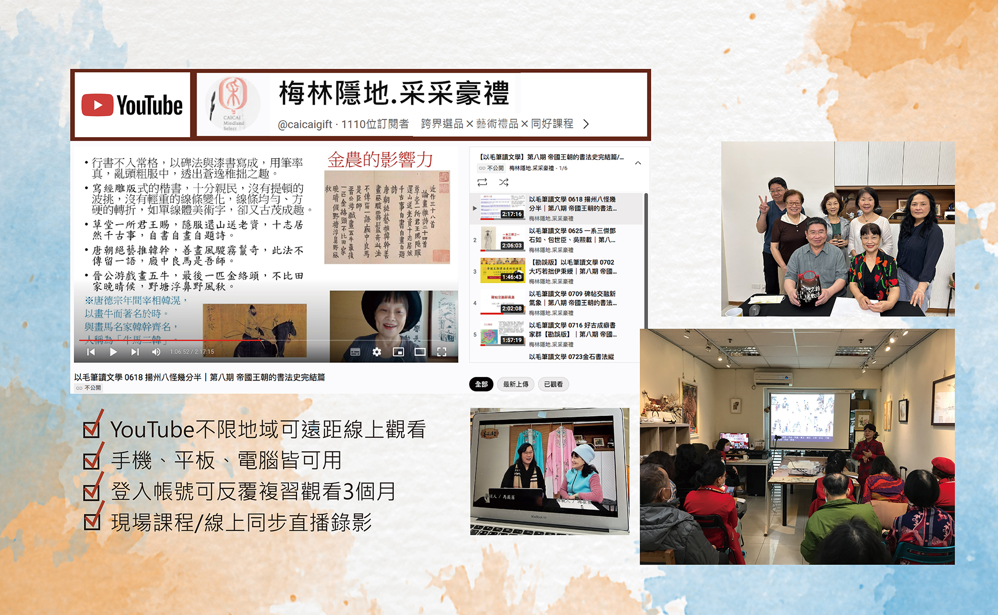 全系列課程分享書法的美與故事,細數歷代書法史、詩歌和碑帖探尋等三大系列主軸,並邀請多位嘉賓一同參與分享,豐富多元的內容讓書畫同好們津津樂道,本次聯合展出學員彼此習寫創作的成果,看見各自的提升並發揚中華書畫的藝術文化!