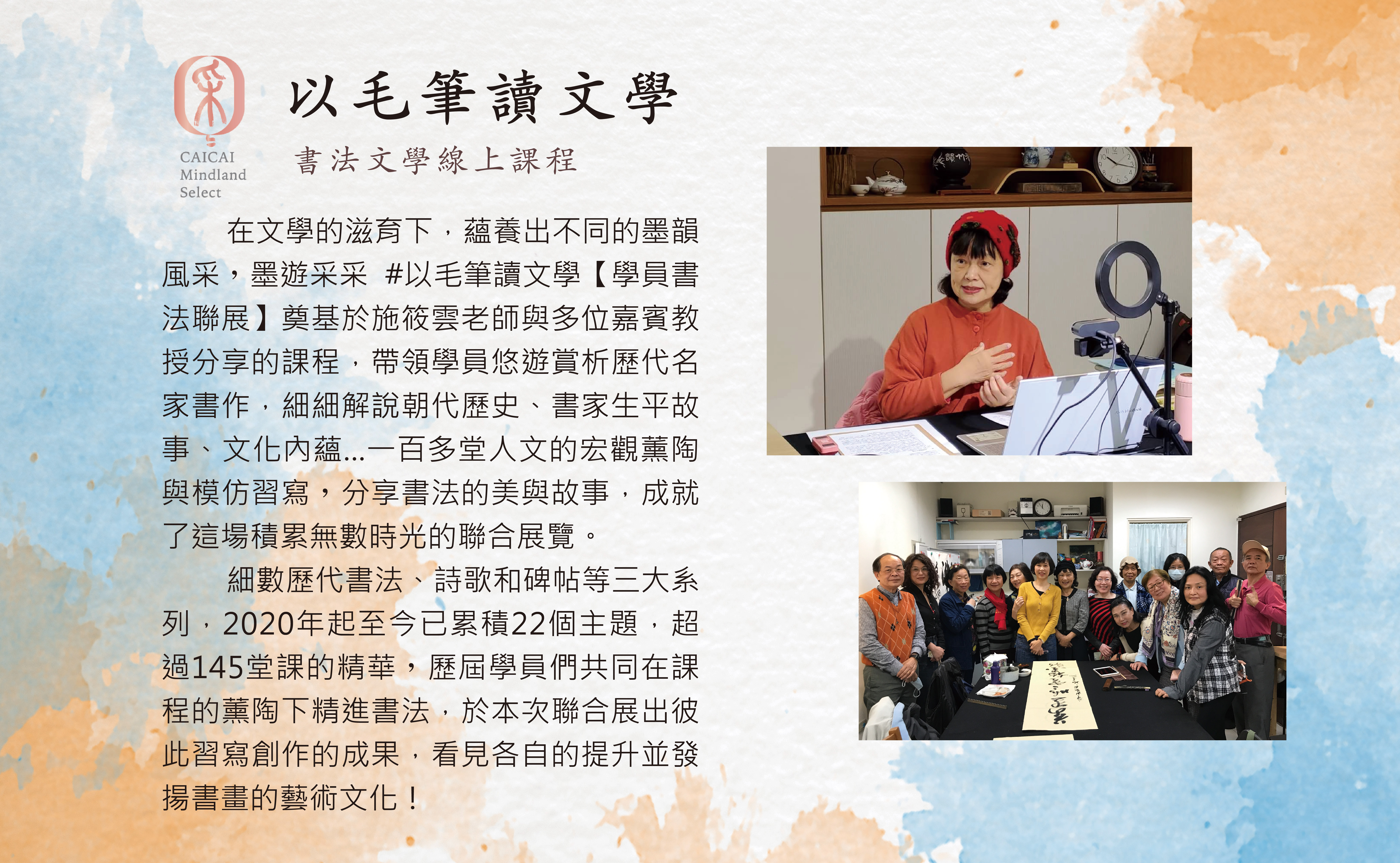 兩年前的約定,我們訂下了書法領域的指標空間,在此熱門的場域終於圓滿了本次展覽!以毛筆讀文學系列課程由施筱雲老師授課,以現場與線上直播同步進行,並挺過疫情期間的困境,於防疫警戒期間線上授課,超越時間與空間的限制,讓偏遠、海外的書法同好也能參加課程,為書法文學的宣揚與人心的定靜安撫盡一份心力!