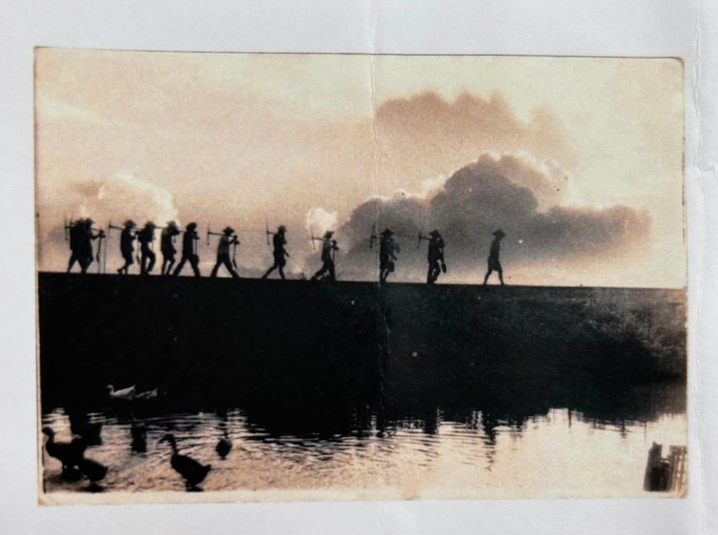 宜蘭有很多地名,五結、六結、七結⋯都有故事,壯圍十三股,菲滿老師的出生地,當初由13個人開墾而起,這幅畫作靈感來自這一張古早的照片…