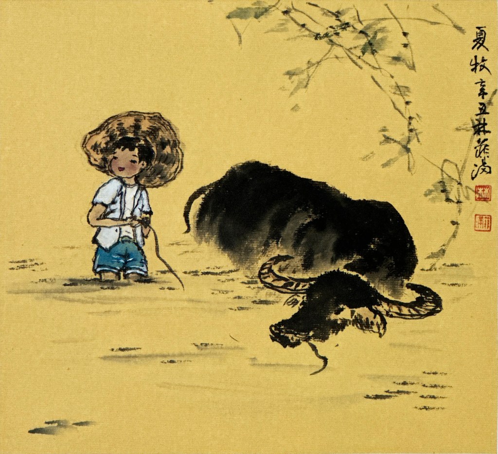 十三股有養牛,菲滿老師從小和牛一起長大,看著牛群泡水與成群的白鷺鷥棲息著。牛的精神 – 勤奮 穩重 踏實 感恩 溫馴,聽聞牛要離別時,還會對主人跪下流淚,對牛特別有感的菲滿老師,因此創作了多幅她記憶中的牛兒們。