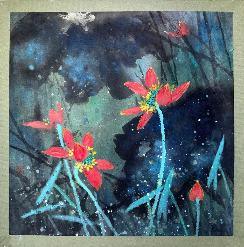 荷花與葉 也是菲滿老師標誌性的符碼,以彩墨的烘托反襯法展現金邊荷花之美,展現了厚實的藝術功力,並象徵在黑暗中的一眸生輝,引領突破挑戰的光芒。