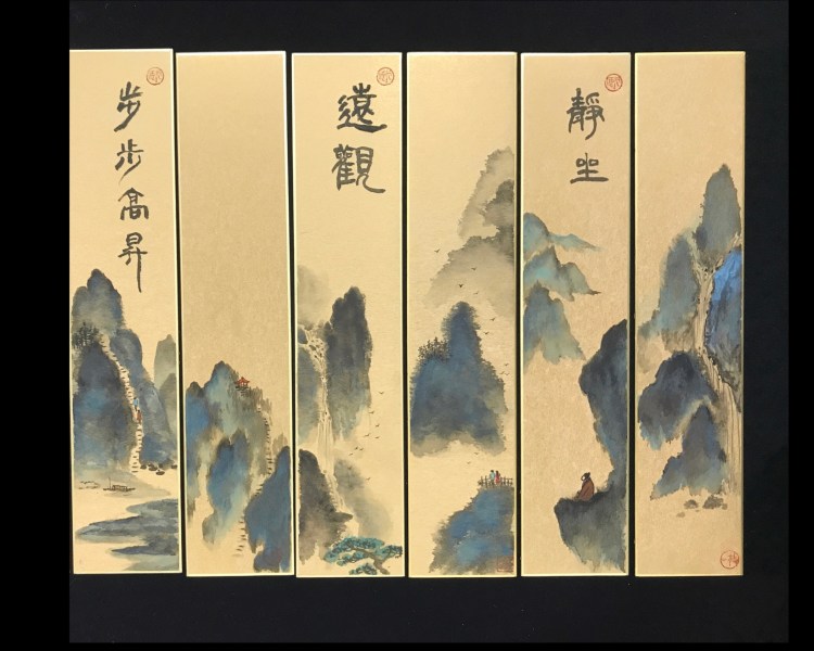 「金潜板流墨茶掛畫」構圖分為四大主題,以篆隸楷行草五種書體題字創作: