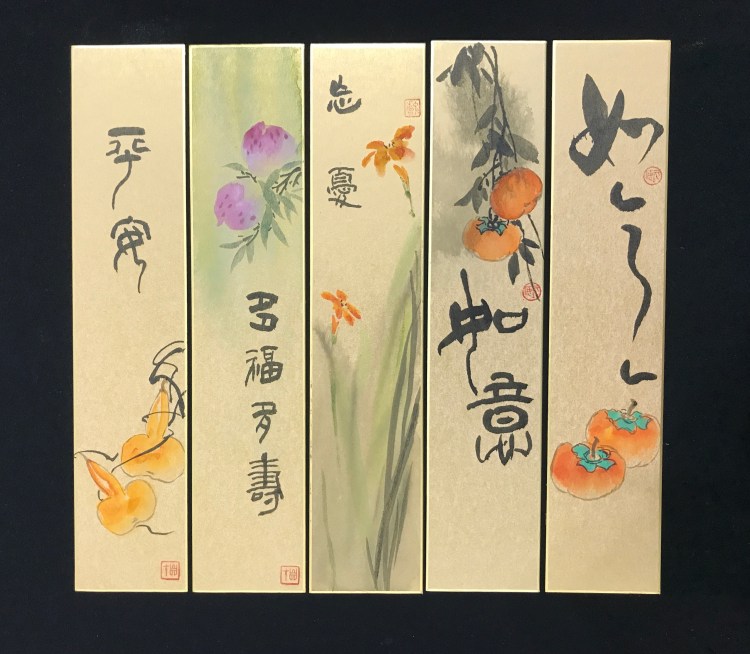 中華書道學會為推廣書藝,免費體驗瓦當拓印、書籤創作書寫,另外,提供金潜板流墨茶掛畫限量收藏,並隨作品附贈快篩劑一份與中華書道學會季刊一本,物超所值。攤位現場金色光芒喜氣加持,創作發想特別帶入五行的觀點,墨色為黑,代表為水,金色潜板,象徵富足,以金生水,有緣收藏風生水起。我們以「惜墨如金」的創作精神,祝福大家「點墨成金」。