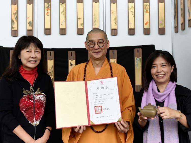 當日上午10點邀請到 中華佛教青年會理事長-大慧法師 蒞臨揮毫 <柿杮如意>,一同響應漢字推廣活動,並贈送快篩劑1000份予學會,為疫情祈福護持,中華書道學會潘慧敏理事長特頒感謝狀,為活動正式揭開序幕。